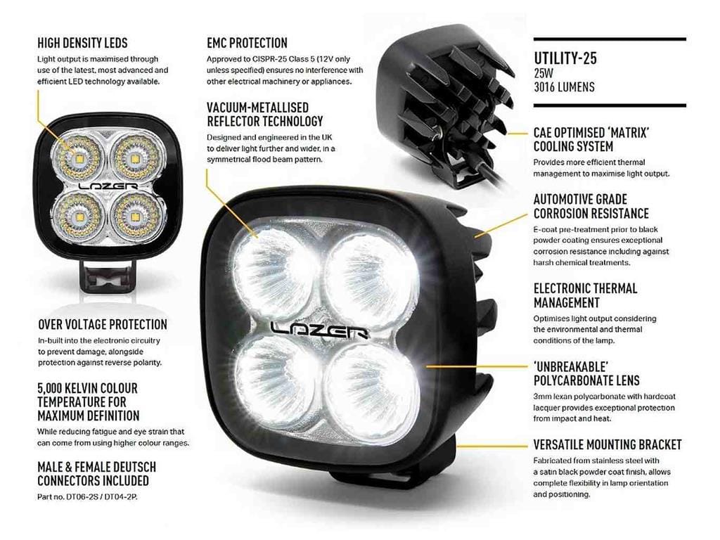 A Utility-25 sorozat a Lazer Lamps középkategóriás professzionális munkalámpái közé tartozik. Az „00U25-B” modell fekete színben érkezik, fekete festéssel vagy eloxált házzal, amely tökéletesen illeszkedik mind a járművekhez, mind munkagépes felhasználásra.